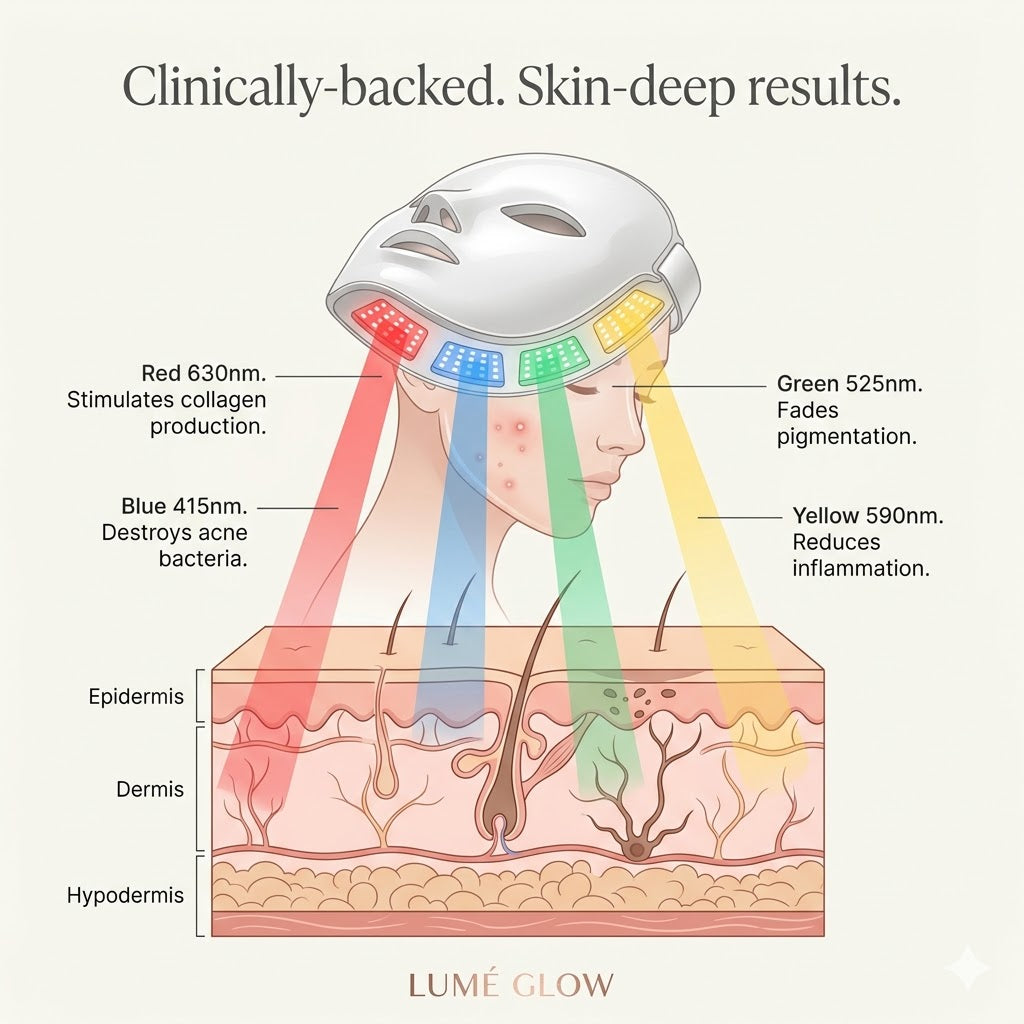LED light therapy has been used in dermatology clinics for decades. It reduces acne, fades fine lines, and restores your skin's natural glow — with zero downtime and zero side effects.